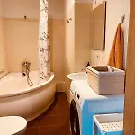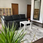 Apartamentu aprīkojumā ir pilnībā aprīkota virtuve ar ledusskapi, cepeškrāsni un virtuves piederumiem, kā arī tējas/kafijas pagatavošanas iekārtu. 53 kv. m lielais apartaments atrodas gandrīz 5 minūšu gājienā no Katolu iela autobusu pieturas.